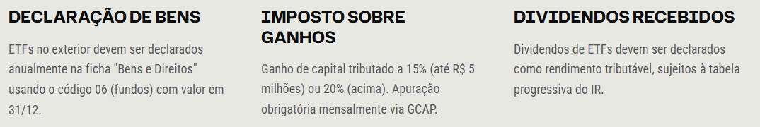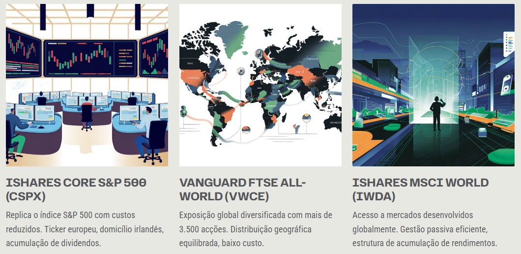 Estes ETFs representam apenas exemplos ilustrativos. A escolha adequada depende de objetivos individuais, horizonte temporal, tolerância ao risco e estratégia global de alocação patrimonial.