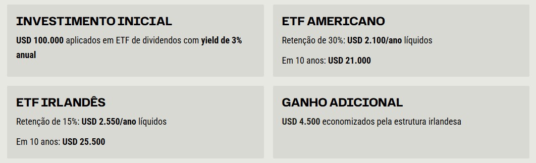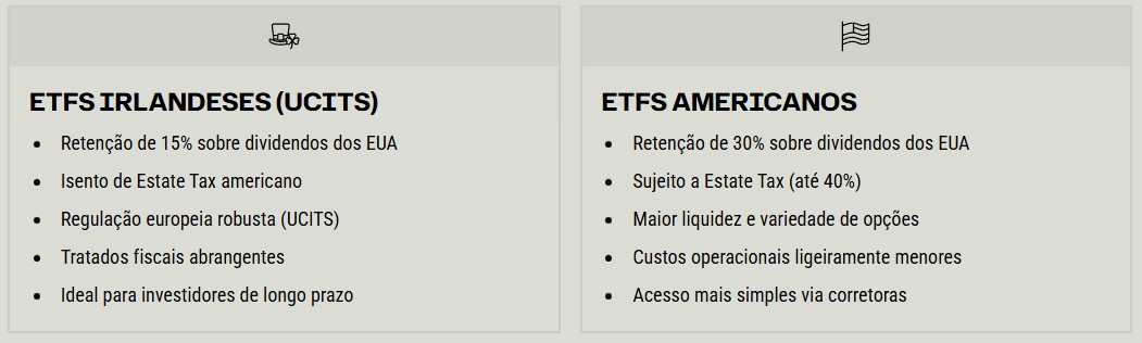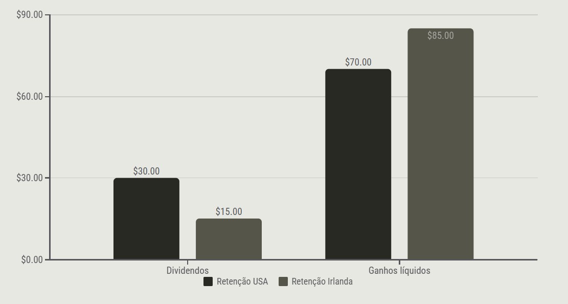 A principal vantagem dos ETFs irlandeses reside na redução da retenção na fonte sobre dividendos provenientes dos Estados Unidos. Enquanto ETFs domiciliados nos EUA retêm 30% para investidores estrangeiros, os irlandeses pagam apenas 15%.